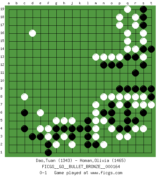 Last move : 0-1 2019 August 21 9:55:45 [Event "FICGS__GO__BULLET_BRONZE__000164"] [Site "FICGS"] [Date "2019.08.21"] [Round "1"] [Black "Dao,Tuan"] [White "Homan,Olivia"] [Result "0-1"] [Rating 1 "1343"] [Rating 2 "1465"] 1.k4 q3 2.q17 d16 3.c4 q15 4.r13 r17 5.r16 q16 6.r15 r14 7.s14 q14 8.q13 p17 9.q18 p18 10.s17 r18 11.s18 q19 12.s19 p13 13.q9 s13 14.s12 s15 15.t14 s16 16.r11 m3 17.l3 m4 18.m2 n2 19.l2 r7 20.r5 r4 21.q5 p7 22.q7 q8 23.q6 p8 24.s9 s8 25.s6 s4 26.q4 p3 27.p4 o4 28.o5 n5 29.o6 n8 30.n6 m6 31.l5 m5 32.l4 m7 33.o7 o8 34.r9 r8 35.t8 t7 36.t9 s7 37.p9 e4 38.e3 f3 39.d3 f4 40.f2 g2 41.f1 j2 42.j3 h3 43.h4 j5 44.j4 h5 45.g4 g5 46.g3 e6 47.c6 c8 48.p12 o13 49.o12 n13 50.n12 m13 0-1 Here are the names of the openings (joseki) played in the four corners : Corner q16 : q17 q15 Komoku (Somok, Xiao~mu`) 3-4 Point. The komoku (3-4) point is the traditional corner enclosure move.. Ikken Takagakari (Hankan Nop'dakeolch'im, Yi Gaogua`jiao~, 1-Space High Approach). The 5-4 approach move has become more popular in modern times, as modern Go emphasizes speed and influence. Corner q4 : q3 q9 Komoku (Somok, Xiao~mu`) 3-4 Point. The komoku (3-4) point is the traditional corner enclosure move.. Corner d4 : c4 e4 Komoku (Somok, Xiao~mu`) 3-4 Point. The komoku (3-4) point is the traditional corner enclosure move.. Ikken Takagakari (Hankan Nop'dakeolch'im, Yi Gaogua`jiao~, 1-Space High Approach). The 5-4 approach move has become more popular in modern times, as modern Go emphasizes speed and influence. Player White won this Go (weiqi, baduk) game. Follow this game move after move (download)Avoid the plate connection. (Anonymous) Waiting for chance ? Play in casinos. (FICGS proverb)
