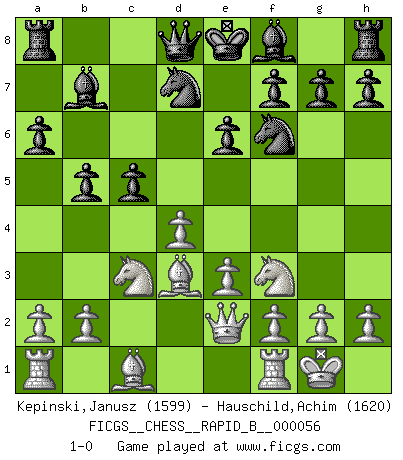 Last move : 1-0 2007 August 4 14:1:48 [Event "FICGS__CHESS__RAPID_B__000056"] [Site "FICGS"] [Date "2007.06.20"] [Round "1"] [White "Kepinski,Janusz"] [Black "Hauschild,Achim"] [Result "1-0"] [WhiteElo "1599"] [BlackElo "1620"] 1.Nf3 d5 2.d4 c5 3.c4 e6 4.e3 Nf6 5.Nc3 a6 6.Bd3 dxc4 7.Bxc4 b5 8.Bd3 Nbd7 9.O-O Bb7 10.Qe2 1-0 This chess game has been lost on time (started : 2007.06.20 12:13:33) Reti Opening Kingside Castling by player White (move 9) Player White won this chess game. Follow this game move after move (download)Spassky will not be psyched out by Fischer. (Mike Goodall) Ich liebe den Moment, wenn ich das Ego meines Gegenüber breche. (Robert James Fischer) El Ajedrez es de 30 a 40 por ciento psicología. Uno no cuenta con esto cuando se juega contra una computadora. No lo puedo confundir. (Judith Polgar) Les échecs, c'est l'imagination. (David Bronstein) If we knew what we were doing, we would not call it research. (Albert Einstein)
