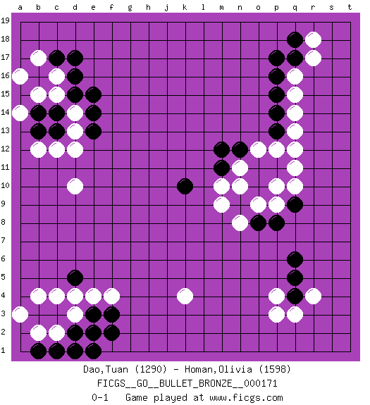 Last move : 0-1 2019 August 21 22:36:7 [Event "FICGS__GO__BULLET_BRONZE__000171"] [Site "FICGS"] [Date "2019.08.21"] [Round "1"] [Black "Dao,Tuan"] [White "Homan,Olivia"] [Result "0-1"] [Rating 1 "1290"] [Rating 2 "1598"] 1.c17 c16 2.q17 q16 3.q4 q3 4.d5 d3 5.c3 c2 6.d2 c4 7.b3 d4 8.c1 e2 9.d1 b4 10.e3 e4 11.f3 b2 12.f2 r17 13.q18 r18 14.p16 q15 15.p15 q14 16.p14 q13 17.p13 q12 18.o11 p4 19.q6 r4 20.q5 p3 21.d16 c15 22.d15 d14 23.c14 b17 24.b16 b15 25.e14 d13 26.b14 a16 27.e1 a3 28.e2 f4 29.a15 a14 30.d17 p12 31.p17 o12 32.e15 q10 33.k10 k4 34.m11 n11 35.n12 n10 36.b1 d10 37.c13 c12 38.b13 b12 39.e13 d12 40.m12 m10 41.o10 o9 42.p11 p10 43.n9 n8 44.o8 m9 45.p8 p9 46.q9 q11 0-1 Here are the names of the openings (joseki) played in the four corners : Corner d16 : c17 c16 San-San (Sam-Sam, San-San) 3-3 Point. The San-San (3-3) point, emphasizing territory at the expense of influence. This move is not recommended. White should envisage 4-4, 5-3, 6-4, 5-4 or 6-3 instead. Corner q16 : q17 q16 Komoku (Somok, Xiao~mu`) 3-4 Point. The komoku (3-4) point is the traditional corner enclosure move.. Corner q4 : q4 q3 Hoshi (Hwajeom, Seongjeom, Xingwei`) 4-4 Point. The star or hoshi (4-4) point, emphasizing influence at the potential expense of territory. Corner d4 : d5 d3 Takamoku (Gomok, Gaomu`) 5-4 Point. The takamoku (high) point (5-4). With its emphasis on influence, the 5-4 point complements the 4-4 (hoshi) point in creating an influence-oriented fuseki. Komoku. Black responds with 3-3, 3-5, 4-6, 4-7, 3-6, 3-7. Player White won this Go (weiqi, baduk) game. Follow this game move after move (download)When you study joseki, you lose two stones in strength. (Anonymous) Live, lose, and learn, by observing your opponent how to win. (Amber Steenbock)