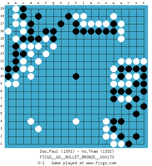 Last move : 0-1 2019 August 21 23:12:9 [Event "FICGS__GO__BULLET_BRONZE__000173"] [Site "FICGS"] [Date "2019.08.21"] [Round "1"] [Black "Dao,Paul"] [White "Vo,Tham"] [Result "0-1"] [Rating 1 "1391"] [Rating 2 "1332"] 1.k10 q15 2.q4 d4 3.d16 o3 4.p3 o4 5.r6 k4 6.k16 c14 7.c15 d14 8.g16 d10 9.q10 q17 10.o16 r12 11.r11 q12 12.s11 q7 13.r8 r7 14.s7 s6 15.s5 s8 16.t6 r9 17.q8 q9 18.p8 p9 19.p7 p10 20.s9 s10 21.t8 r10 22.t10 s12 23.q11 p11 24.t11 t12 25.t9 c17 26.d17 b15 27.b16 c16 28.d15 b17 29.b14 a16 30.b13 c12 31.c13 d13 32.b12 c11 33.b11 b10 34.a10 a9 35.a11 b9 36.d12 e12 37.e13 e14 38.f14 f13 39.e15 d11 40.c18 b18 41.c19 b19 42.e18 m17 43.m16 l17 44.l16 n17 45.n16 o17 46.p16 q16 47.p17 p18 48.k17 k18 49.j18 l18 50.h17 g14 51.g15 f15 52.f16 p2 53.q2 o2 54.p4 q1 55.r1 p1 56.s2 e3 0-1 Here are the names of the openings (joseki) played in the four corners : Corner q4 : q4 o3 Hoshi (Hwajeom, Seongjeom, Xingwei`) 4-4 Point. The star or hoshi (4-4) point, emphasizing influence at the potential expense of territory. Ikken Kakari (Hankan Keolch'im, Yi Gua`jiao~, 1-Space Low Approach). White 2 is the standard approach move to the 4-4. Corner d16 : d16 c14 Hoshi (Hwajeom, Seongjeom, Xingwei`) 4-4 Point. The star or hoshi (4-4) point, emphasizing influence at the potential expense of territory. Ikken Kakari (Hankan Keolch'im, Yi Gua`jiao~, 1-Space Low Approach). White 2 is the standard approach move to the 4-4. Player White won this Go (weiqi, baduk) game. Follow this game move after move (download)At the head of two stones in a row, play hane. (Anonymous) When the going gets tactical, the computers get going. (Hyatt)