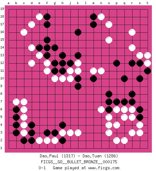 Last move : 0-1 2019 August 21 23:52:16 [Event "FICGS__GO__BULLET_BRONZE__000175"] [Site "FICGS"] [Date "2019.08.21"] [Round "1"] [Black "Dao,Paul"] [White "Dao,Tuan"] [Result "0-1"] [Rating 1 "1317"] [Rating 2 "1286"] 1.k10 r16 2.q4 c16 3.d4 o3 4.p3 o4 5.q10 k3 6.g3 c4 7.d3 c3 8.b5 c6 9.b6 c7 10.d2 e2 11.c2 b7 12.b3 c5 13.b4 d12 14.k16 o17 15.m17 o15 16.f17 d17 17.f15 d14 18.f13 f11 19.g11 g10 20.h11 f12 21.g12 e13 22.e14 g13 23.f14 h10 24.j12 j11 25.h12 k12 26.g14 k11 27.h13 j10 28.k13 r6 29.r8 p6 30.o8 r3 31.r4 s4 32.s5 s3 33.s6 p2 34.q3 q2 35.p5 r5 36.r7 q6 37.o6 o5 38.p7 n6 39.o7 p4 40.q7 q5 41.r12 r14 42.p12 s13 43.s12 t12 44.t11 t13 45.s10 n18 46.m18 e18 47.f18 g2 48.f3 f2 49.h2 h3 50.h4 j3 51.k9 m11 52.m10 n11 0-1 Here are the names of the openings (joseki) played in the four corners : Corner q4 : q4 o3 Hoshi (Hwajeom, Seongjeom, Xingwei`) 4-4 Point. The star or hoshi (4-4) point, emphasizing influence at the potential expense of territory. Ikken Kakari (Hankan Keolch'im, Yi Gua`jiao~, 1-Space Low Approach). White 2 is the standard approach move to the 4-4. Player White won this Go (weiqi, baduk) game. Follow this game move after move (download)Proverbs do not apply to White. (Tero Sand) It is not titles that honor men, but men that honor titles. (Niccolo Machiavelli)