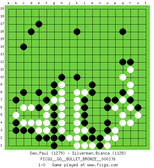 Last move : 1-0 2019 August 22 0:16:53 [Event "FICGS__GO__BULLET_BRONZE__000176"] [Site "FICGS"] [Date "2019.08.22"] [Round "1"] [Black "Dao,Paul"] [White "Silverman,Bianca"] [Result "1-0"] [Rating 1 "1279"] [Rating 2 "1128"] 1.k10 q4 2.d16 d4 3.k16 q10 4.q16 k4 5.o3 p3 6.o4 o2 7.n2 p2 8.m3 l3 9.l2 k2 10.l4 k3 11.l5 k5 12.l6 k6 13.l7 k7 14.c3 c4 15.d3 e3 16.e2 f3 17.f2 g2 18.b4 b5 19.b3 c6 20.g3 h3 21.g4 e4 22.h2 j2 23.g1 h4 24.g5 h5 25.g6 h6 26.g8 g7 27.f7 h7 28.e8 f6 29.e6 f5 30.c8 d6 31.c14 h8 32.g9 h9 33.h10 k8 34.m9 l8 35.m8 l1 36.m2 m1 37.n1 k1 38.e17 o1 39.q12 r11 40.q8 r8 41.r7 r9 42.r5 r4 43.r12 q5 44.q6 s5 45.s6 r6 46.b7 q7 47.p7 p6 48.r5 f4 49.g2 r6 50.o6 q7 51.o7 1-0 Here are the names of the openings (joseki) played in the four corners : Corner q4 : q4 o3 Hoshi (Hwajeom, Seongjeom, Xingwei`) 4-4 Point. The star or hoshi (4-4) point, emphasizing influence at the potential expense of territory. Ikken Kakari (Hankan Keolch'im, Yi Gua`jiao~, 1-Space Low Approach). Black 2 is the standard approach move to the 4-4. Corner d4 : d4 c3 Hoshi (Hwajeom, Seongjeom, Xingwei`) 4-4 Point. The star or hoshi (4-4) point, emphasizing influence at the potential expense of territory. Player Black won this Go (weiqi, baduk) game. Follow this game move after move (download)In the sound of the stone you can hear its purpose. (Pierre Audouard) Now be brave and don't look back. Don't look back. (Shmi Skywalker in Star Wars ep.1)