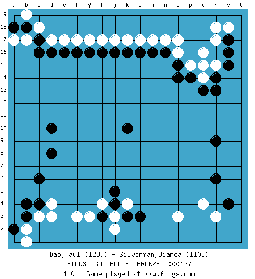 Last move : 1-0 2019 August 22 0:28:36 [Event "FICGS__GO__BULLET_BRONZE__000177 "] [Site "FICGS"] [Date "2019.08.22"] [Round "1"] [Black "Dao,Paul "] [White "Silverman,Bianca "] [Result "1-0"] [Rating 1 "1299"] [Rating 2 "1108"] 1.k10 q4 2.r6 o3 3.s4 r3 4.r9 q16 5.r14 o17 6.s16 r17 7.s17 r18 8.p14 d4 9.n16 n17 10.m16 m17 11.l16 l17 12.k16 k17 13.j16 j17 14.h16 h17 15.g16 g17 16.f16 f17 17.e16 e17 18.d16 d17 19.c17 c18 20.b18 b17 21.c16 b19 22.a18 a17 23.c6 f3 24.d10 o16 25.o15 p15 26.o14 q14 27.q13 q15 28.r13 r15 29.s15 s18 30.b4 c3 31.d8 k4 32.b3 b2 33.a2 b1 34.c4 d3 35.h3 h4 36.j4 j3 37.j5 g3 38.k3 j2 39.l3 1-0 Here are the names of the openings (joseki) played in the four corners : Corner q4 : q4 r6Hoshi (Hwajeom, Seongjeom, Xingwei`) 4-4 Point. The star or hoshi (4-4) point, emphasizing influence at the potential expense of territory.Ikken Kakari (Hankan Keolch'im, Yi Gua`jiao~, 1-Space Low Approach). Black 2 is the standard approach move to the 4-4. Corner q16 : q16 r14Hoshi (Hwajeom, Seongjeom, Xingwei`) 4-4 Point. The star or hoshi (4-4) point, emphasizing influence at the potential expense of territory.Ikken Kakari (Hankan Keolch'im, Yi Gua`jiao~, 1-Space Low Approach). Black 2 is the standard approach move to the 4-4. Corner d16 : j16 j17This joseki is unknown. A weak or weird move has probably been played in this corner. Corner d4 : d4 c6Hoshi (Hwajeom, Seongjeom, Xingwei`) 4-4 Point. The star or hoshi (4-4) point, emphasizing influence at the potential expense of territory.Ikken Kakari (Hankan Keolch'im, Yi Gua`jiao~, 1-Space Low Approach). Black 2 is the standard approach move to the 4-4. Player Black won this Go (weiqi, baduk) game.Follow this game move after move (download ) A few moments to learn, a lifetime to master. (Ancient proverb) Thus, what is of supreme importance in war is to attack the enemy's strategy. (Sun Tzu)