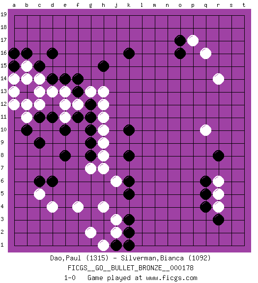Last move : 1-0 2019 August 22 0:43:53 [Event "FICGS__GO__BULLET_BRONZE__000178"] [Site "FICGS"] [Date "2019.08.22"] [Round "1"] [Black "Dao,Paul"] [White "Silverman,Bianca"] [Result "1-0"] [Rating 1 "1315"] [Rating 2 "1092"] 1.k10 q16 2.q4 d4 3.d16 q10 4.o17 p17 5.o16 r14 6.k16 c14 7.d14 d13 8.e14 e13 9.c15 b15 10.b16 b14 11.f13 f12 12.g12 g13 13.f14 h12 14.g11 h13 15.h15 h11 16.g10 h10 17.g9 h9 18.g8 h8 19.d11 c12 20.c11 e11 21.e10 b11 22.b10 a12 23.b13 a13 24.c9 b12 25.a15 a14 26.a16 c13 27.f11 e12 28.c6 c5 29.d6 f4 30.k8 h7 31.k6 j6 32.k5 g7 33.e8 h4 34.k3 j3 35.k2 j2 36.j1 h1 37.k1 g2 38.r8 r6 39.q6 r4 40.r3 r5 41.q5 1-0 Here are the names of the openings (joseki) played in the four corners : Corner q16 : q16 o17 Hoshi (Hwajeom, Seongjeom, Xingwei`) 4-4 Point. The star or hoshi (4-4) point, emphasizing influence at the potential expense of territory. Ikken Kakari (Hankan Keolch'im, Yi Gua`jiao~, 1-Space Low Approach). Black 2 is the standard approach move to the 4-4. Corner d16 : d16 c14 Hoshi (Hwajeom, Seongjeom, Xingwei`) 4-4 Point. The star or hoshi (4-4) point, emphasizing influence at the potential expense of territory. Ikken Kakari (Hankan Keolch'im, Yi Gua`jiao~, 1-Space Low Approach). White 2 is the standard approach move to the 4-4. Corner d4 : d4 g9 Hoshi (Hwajeom, Seongjeom, Xingwei`) 4-4 Point. The star or hoshi (4-4) point, emphasizing influence at the potential expense of territory. Player Black won this Go (weiqi, baduk) game. Follow this game move after move (download)Ikken tobi is never wrong. (Anonymous) An expert is a man who has made all the mistakes which can be made in a very narrow field. (Niels Bohr)