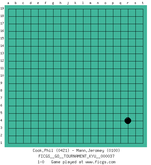 Last move : 1-0 2007 July 22 12:17:29 [Event "FICGS__GO__TOURNAMENT_KYU__000037"] [Site "FICGS"] [Date "2007.06.21"] [Round "1"] [Black "Cook,Phil"] [White "Mann,Jeromey"] [Result "1-0"] [Rating 1 "0421"] [Rating 2 "0100"] 1.r4 1-0 This go game has been lost on time (started : 2007.06.21 21:37:48) Here are the names of the openings (joseki) played in the four corners : Corner q4 : r4 1-0 Komoku (Somok, Xiao~mu`) 3-4 Point. The komoku (3-4) point is the traditional corner enclosure move.. Player Black won this Go (weiqi, baduk) game. Follow this game move after move (download)Win the early ko to win the game. (Anonymous) My poor ole parrot... Is not in the circulation of displays ....poo hoo hoo :) (Wayne Lowrance's enigma)