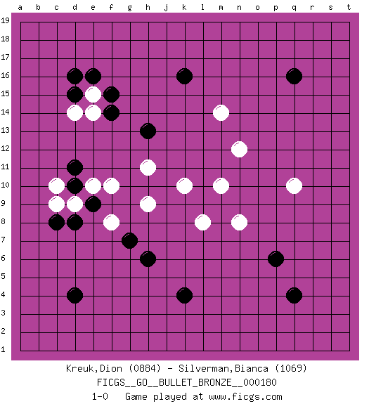 Last move : 1-0 2019 August 22 1:3:53 [Event "FICGS__GO__BULLET_BRONZE__000180"] [Site "FICGS"] [Date "2019.08.22"] [Round "1"] [Black "Kreuk,Dion"] [White "Silverman,Bianca"] [Result "1-0"] [Rating 1 "0884"] [Rating 2 "1069"] 1.d16 k10 2.q16 l8 3.d4 h9 4.q4 m10 5.h13 n8 6.h6 f10 7.k4 h11 8.k16 n12 9.d10 q10 10.p6 m14 11.f15 e10 12.e9 d9 13.d8 c9 14.c8 c10 15.d11 d14 16.d15 e14 17.f14 e15 18.e16 f8 19.g7 1-0 Here are the names of the openings (joseki) played in the four corners : Corner d4 : d4 h9 Hoshi (Hwajeom, Seongjeom, Xingwei`) 4-4 Point. The star or hoshi (4-4) point, emphasizing influence at the potential expense of territory. Corner q4 : l8 q4 This joseki is unknown. A weak or weird move has probably been played in this corner. Corner q16 : q16 n12 Hoshi (Hwajeom, Seongjeom, Xingwei`) 4-4 Point. The star or hoshi (4-4) point, emphasizing influence at the potential expense of territory. Player Black won this Go (weiqi, baduk) game. Follow this game move after move (download)In opponents' sphere of influence, avoid sharp conflict, don't move too deep. (Otake Hideo, 9p) To err is human, to shift the blame on someone else is tactical. (Mladen Jankovic)