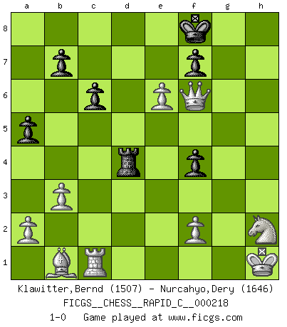 Last move : 1-0 2019 October 12 15:50:12 [Event "FICGS__CHESS__RAPID_C__000218"] [Site "FICGS"] [Date "2019.08.24"] [Round "1"] [White "Klawitter,Bernd"] [Black "Nurcahyo,Dery"] [Result "1-0"] [WhiteElo "1507"] [BlackElo "1646"] 1.d4 c6 2.e4 d6 3.c3 Nf6 4.Bd3 Nbd7 5.h3 h6 6.Nf3 g5 7.Be3 e5 8.O-O Bg7 9.Na3 exd4 10.cxd4 Nb6 11.Rc1 Be6 12.b3 Qc7 13.Nb5 Qd7 14.Nxd6+ Kf8 15.e5 Nh5 16.Nh2 Nf4 17.Bxf4 gxf4 18.Bb1 Nc8 19.Nxc8 Rxc8 20.Nf3 Bxh3 21.gxh3 Qxh3 22.Nh2 Rg8 23.Kh1 Rd8 24.Qf3 Qh4 25.Rg1 Bh8 26.Rxg8+ Kxg8 27.Qg4+ Kf8 28.Qxh4 Rxd4 29.Qxh6+ Ke7 30.Qxh8 a5 31.Qf6+ Kf8 32.e6 1-0 Queen's pawn Kingside Castling by player White (move 8) Player White won this chess game. Follow this game move after move (download)If cunning alone were needed to excel, women would be the best Chess players. (Albin) Zeige mir drei Eröffnungsvarianten und ich beweise dir, dass zwei davon inkorrekt sind. (Emanuel Lasker) Aunque la mayoría de la gente disfruta observar las partidas de los grandes Maestros de ataque, algunos de los jugadores mas notables en la historia han sido los jugadores silenciosos posicionales. Lentamente ellos te aplastan despojandote de tu espacio, congestionando tus piezas y dejandote virtualmente sin nada que hacer. (Yasser Seirawan) Avant la finale, les dieux ont créé le milieu de partie. (Tarrasch) Train yourself to let go of everything you fear to lose. (Master Yoda in Star Wars ep.3)
