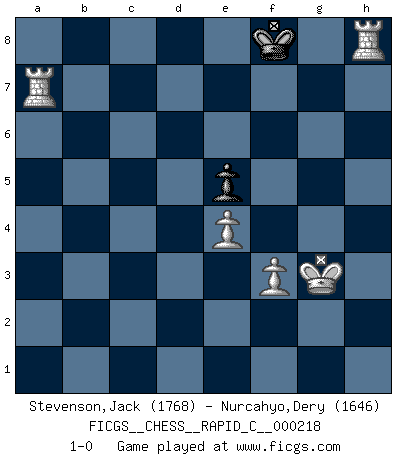 Last move : 1-0 2019 November 5 17:47:12 [Event "FICGS__CHESS__RAPID_C__000218"] [Site "FICGS"] [Date "2019.08.24"] [Round "1"] [White "Stevenson,Jack"] [Black "Nurcahyo,Dery"] [Result "1-0"] [WhiteElo "1768"] [BlackElo "1646"] 1.e4 c5 2.Nf3 d6 3.d4 Nf6 4.Nc3 e6 5.dxc5 e5 6.Bb5+ Nc6 7.Bg5 a6 8.Bc4 h6 9.Be3 Be6 10.Bxe6 fxe6 11.cxd6 Bxd6 12.Qe2 Qc7 13.O-O O-O-O 14.Na4 Qa5 15.Nb6+ Kc7 16.Nc4 Qb5 17.Bb6+ Kd7 18.Bxd8 Rxd8 19.Qd3 Ke7 20.Nxd6 Rxd6 21.Qxb5 axb5 22.Rfe1 Nb4 23.Re2 g5 24.Nxe5 Nc6 25.Nxc6+ Rxc6 26.c3 e5 27.f3 Rd6 28.a4 bxa4 29.Rxa4 g4 30.Ra7 Rd1+ 31.Kf2 Rd7 32.c4 Rc7 33.Rd2 gxf3 34.gxf3 Nh5 35.Rd5 Ke6 36.c5 Nf6 37.Rd6+ Ke7 38.Rb6 Rxc5 39.R6xb7+ Kf8 40.Rf7+ Ke8 41.Rxf6 Rc2+ 42.Kg3 Rxb2 43.Rxh6 Rxh2 44.Rxh2 Kf8 45.Rh8+ 1-0 Sicilian Kingside Castling by player White (move 13) Queenside Castling by player Black (move 13) 10 pieces endgame at move 42 : White KRRPPP , Black KRPP WHITE : King + 2 Rooks 3 Pawns BLACK : King + 1 Rook 2 Pawns 9 pieces endgame at move 43 : White KRRPPP , Black KRP WHITE : King + 2 Rooks 3 Pawns BLACK : King + 1 Rook 1 Pawn 8 pieces endgame at move 43 : White KRRPP , Black KRP WHITE : King + 2 Rooks 2 Pawns BLACK : King + 1 Rook 1 Pawn 7 pieces endgame at move 44 : White KRRPP , Black KP WHITE : King + 2 Rooks 2 Pawns BLACK : King + 1 Pawn Player White won this chess game. Follow this game move after move (download)I played Chess with him and would have beaten him sometimes only he always took back his last move, and ran the game out differently. (Mark Twain) Schach verlangt totale Konzentration. (Robert James Fischer) Tu sabes que vas a perder. Aún cuando tenía la ventaja, yo sabía que iba a perder. - al estar jugando con Fischer (Andrew Soltis) Celui qui prend des risques peut perdre, celui qui n'en prend pas perd toujours. (Xavier Tartacover) It's not a bug - it's an undocumented feature. (Anonymous)