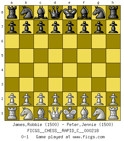 Last move : 0-1 2019 September 24 3:29:30 [Event "FICGS__CHESS__RAPID_C__000218"] [Site "FICGS"] [Date "2019.08.24"] [Round "1"] [White "James,Robbie"] [Black "Peter,Jennie"] [Result "0-1"] [WhiteElo "1500"] [BlackElo "1500"] 0-1 This chess game has been lost on time (started : 2019.08.24 17:50:52) Player Black won this chess game. Follow this game move after move (download)There must have been a time when men were demigods, or they could not have invented Chess. (Gustav Schenk) Obwohl ich vom Stil her kaum zu den Priestern der Schachkunst gezählt werde, halte ich Schach doch für eine Kunst. (Tigran Petrosjan) Botvinnik trataba de restarle el misterio al Ajedrez, siempre relacionandolo a situaciones de la vida ordinaria. El gustaba de llamar al Ajedrez un típico problema inexacto similar a aquellos de los cuales la gente siempre tiene que enfrentarse en la vida cotidiana. (Garry Kasparov) La solitude du joueur d'Echecs à l'approche du mat est semblable à celle du condamné. (Francis Szpiner) Opportunities multiply as they are seized. (Sun Tzu)