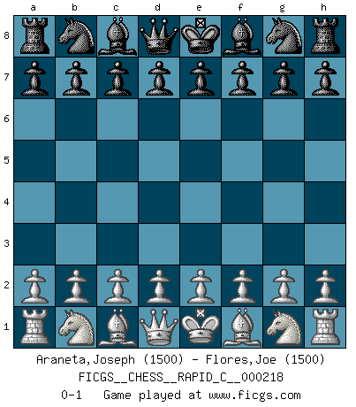 Last move : 0-1 2019 September 24 3:29:30 [Event "FICGS__CHESS__RAPID_C__000218"] [Site "FICGS"] [Date "2019.08.24"] [Round "1"] [White "Araneta,Joseph"] [Black "Flores,Joe"] [Result "0-1"] [WhiteElo "1500"] [BlackElo "1500"] 0-1 This chess game has been lost on time (started : 2019.08.24 17:50:52) Player Black won this chess game. Follow this game move after move (download)What is the difference between chess and football? Everybody understands football, but nobody plays it. Everybody plays chess, but nobody understands it. Everything is relative. (Vladimir Kramnik) Um sich vor der Gefahr einer Erkältung zu schützen, sorge der wanderlustige König beizeiten für ein brauchbares Versteck. (Aaron Nimzowitsch) El ganador de una partida es aquel jugador que hace el penúltimo error. (Savielly Tartakover) Aucun coup ne doit être joué sans but. (Pedro Damiano) An expert is a man who has made all the mistakes which can be made in a very narrow field. (Niels Bohr)