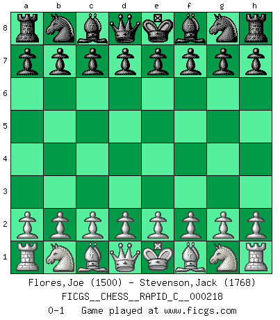 Last move : 0-1 2019 September 24 3:29:30 [Event "FICGS__CHESS__RAPID_C__000218"] [Site "FICGS"] [Date "2019.08.24"] [Round "1"] [White "Flores,Joe"] [Black "Stevenson,Jack"] [Result "0-1"] [WhiteElo "1500"] [BlackElo "1768"] 0-1 This chess game has been lost on time (started : 2019.08.24 17:50:52) Player Black won this chess game. Follow this game move after move (download)Chess is a terrible game. If you have no center, your opponent has a freer position. If you do have a center, then you really have something to worry about ! (Siegbert Tarrasch) Der vorletzte Fehler gewinnt. (Savielly Grigorievitsch Tartakower) No soy una persona materialista y por eso, no resiento la falta o pérdida del dinero. La ausencia de cosas mundanas carece de importancia. Ya que el Ajedrez es una forma en la que puedo ser tan materialista como yo desee sin tener la necesidad de vender mi alma. (Jamie Walter Adams) Vous n'êtes pas toujours obligé de jouer le meilleur coup. Un coup doit être actif, entreprenant, correct et beau ! (David Bronstein) All men can see these tactics whereby I conquer, but what none can see is the strategy out of which victory is evolved. (Sun Tzu)