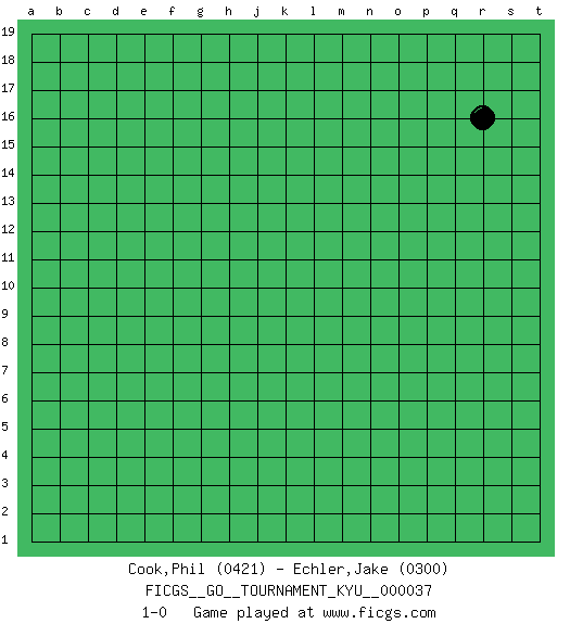 Last move : 1-0 2007 July 22 12:17:29 [Event "FICGS__GO__TOURNAMENT_KYU__000037"] [Site "FICGS"] [Date "2007.06.21"] [Round "1"] [Black "Cook,Phil"] [White "Echler,Jake"] [Result "1-0"] [Rating 1 "0421"] [Rating 2 "0300"] 1.r16 1-0 This go game has been lost on time (started : 2007.06.21 21:37:48) Here are the names of the openings (joseki) played in the four corners : Player Black won this Go (weiqi, baduk) game. Follow this game move after move (download)With only one group, you will win. (Anonymous) Art disturbs, science reassures. (Georges Braque, Le Jour et la Nuit)