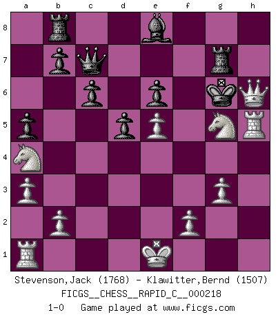 Last move : 1-0 2019 September 12 11:21:24 [Event "FICGS__CHESS__RAPID_C__000218"] [Site "FICGS"] [Date "2019.08.24"] [Round "1"] [White "Stevenson,Jack"] [Black "Klawitter,Bernd"] [Result "1-0"] [WhiteElo "1768"] [BlackElo "1507"] 1.e4 c6 2.d4 d5 3.e5 e6 4.Be3 Bd7 5.c4 Ne7 6.Nf3 Ng6 7.a3 Be7 8.c5 O-O 9.Bd3 a5 10.Nc3 Na6 11.g3 Re8 12.h4 Nf8 13.Na4 h6 14.Nb6 Rb8 15.Qd2 Ng6 16.Bxh6 Nxc5 17.dxc5 Bxc5 18.Na4 Bf8 19.Bg5 Qc7 20.Bxg6 fxg6 21.h5 gxh5 22.Rxh5 Be7 23.Bxe7 Rxe7 24.Qd3 g6 25.Qxg6+ Rg7 26.Qh6 Be8 27.Qh8+ Kf7 28.Ng5+ Kg6 29.Qh6+ 1-0 Caro-Kann : Advance variation Kingside Castling by player Black (move 8) Player White won this chess game. Follow this game move after move (download)I have added these principles to the law: get the Knights into action before both Bishops are developed. (Emanuel Lasker) Wenn ich Weiß habe gewinne ich weil ich Weiß habe, wenn ich Schwarz habe gewinne ich weil ich Bogoljubov bin. (Efim Bogoljubov) Yo no le temo a Spassky. Todos saben que yo soy el mejor. Uno no necesita un torneo para probarlo. (Bobby Fischer) Echiquier : carré parfait, comme la Jérusalem nouvelle décrite par l'auteur de l'Apocalypse, huit cases sur huit, exaltation du chiffre 4, symbole du cosmos aux quatre horizons... où le noir et le blanc, l'ombre et la lumière, le mal et le bien s'entremêlent et se conjuguent. (Robert Couffignal, Le Gambit du poète) A good teacher is like a candle - it consumes itself to light the way for others. (Author unknown)