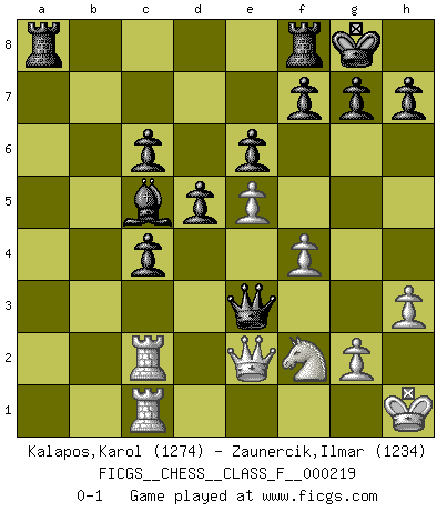 Last move : 0-1 2019 September 10 9:52:10 [Event "FICGS__CHESS__CLASS_F__000219"] [Site "FICGS"] [Date "2019.08.24"] [Round "1"] [White "Kalapos,Karol"] [Black "Zaunercik,Ilmar"] [Result "0-1"] [WhiteElo "1274"] [BlackElo "1234"] 1.Nf3 d5 2.d4 Nc6 3.e3 Bg4 4.Be2 e6 5.O-O Nf6 6.Nbd2 Bd6 7.h3 Bh5 8.c4 O-O 9.c5 Be7 10.Ne5 Bxe2 11.Qxe2 Nxe5 12.dxe5 Nd7 13.f4 Nxc5 14.b3 c6 15.Ba3 a5 16.Rac1 b6 17.Rc2 Qd7 18.Rd1 a4 19.Nc4 axb3 20.axb3 Qc7 21.Bxc5 bxc5 22.Nb2 Qb6 23.Kh1 Qxb3 24.Nd3 c4 25.Nf2 Bc5 26.Rdc1 Qxe3 0-1 Reti Opening Kingside Castling by player White (move 5) Kingside Castling by player Black (move 8) Player Black won this chess game. Follow this game move after move (download)Chess, like any creative activity, can exist only through the combined efforts of those who have creative talent, and those who have the ability to organize their creative work. (Mikhail Botvinnik) Frage des Reporters: -Worin besteht das Ziel von Gambiteröffnungen? Antwort: -Auf Kosten der Partie einen Ruf als Angriffspieler zu erwerben.- (Siegbert Tarrasch) Los errores estan ahí, esperando a que se cometan. (Savielly Tartakower) Toutes les manuvres exécutées sur une colonne ouverte ont pour but ultime l'intrusion définitive sur la septième ou la huitième rangée, en plein cur de la position ennemie. (Aaron Nimzovitch) Lamb in skin of tiger, still fears the wolf. (Chinese proverb)