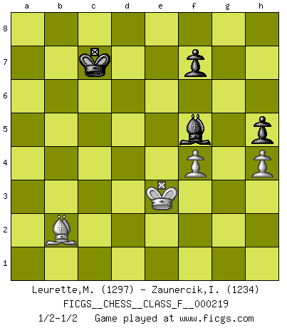 Last move : 1/2-1/2 2019 September 12 17:22:7 [Event "FICGS__CHESS__CLASS_F__000219"] [Site "FICGS"] [Date "2019.08.24"] [Round "1"] [White "Leurette,Marc-Antoine"] [Black "Zaunercik,Ilmar"] [Result "1/2-1/2"] [WhiteElo "1297"] [BlackElo "1234"] 1.e4 e5 2.Nf3 Nc6 3.Bc4 Bc5 4.c3 a6 5.d4 Bd6 6.O-O Nf6 7.dxe5 Bxe5 8.Nxe5 Nxe5 9.Nd2 Nxc4 10.Nxc4 d5 11.exd5 Qxd5 12.Qxd5 Nxd5 13.Re1+ Be6 14.Ne3 O-O-O 15.Nxd5 Rxd5 16.b3 Rhd8 17.c4 Rd3 18.f3 a5 19.Bb2 g6 20.Bg7 a4 21.Bf6 R8d7 22.Bg5 b6 23.Rab1 Kb7 24.Kf2 h5 25.Rb2 axb3 26.axb3 Rd1 27.R1e2 Ra1 28.Re1 Ra3 29.Re3 Rd1 30.Re1 Rd3 31.Re3 Rxe3 32.Bxe3 c5 33.b4 Bxc4 34.bxc5 b5 35.Rd2 Rd3 36.Rxd3 Bxd3 37.h4 b4 38.Bd4 Kc6 39.Ke3 Bf1 40.g3 Kd5 41.g4 Bb5 42.gxh5 gxh5 43.f4 Bd7 44.Kd3 Bf5+ 45.Ke3 Kc4 46.c6 b3 47.Be5 Kd5 48.c7 Kc6 49.Kd2 b2 50.Bxb2 Kxc7 51.Ke3 1/2-1/2 Giuoco Piano Kingside Castling by player White (move 6) Queenside Castling by player Black (move 14) 10 pieces endgame at move 42 : White KBPPP , Black KBPPP WHITE : King + 1 Bishop 3 Pawns BLACK : King + 1 Bishop 3 Pawns 9 pieces endgame at move 50 : White KBPPP , Black KBPP WHITE : King + 1 Bishop 3 Pawns BLACK : King + 1 Bishop 2 Pawns 8 pieces endgame at move 50 : White KBPP , Black KBPP WHITE : King + 1 Bishop 2 Pawns BLACK : King + 1 Bishop 2 Pawns This chess game ended in a draw. Follow this game move after move (download)Chess is a fighting game which is purely intellectual and includes chance. (Richard Reti) Das Spiel gibt uns die Genugtuung, die das Leben uns versagt. (Emanuel Lasker) El Ajedrez es un terrible juego. Si no controlas el centro, tu oponente tiene una posición mas holgada. Si tienes control del centro, ¡entonces realmente tu tienes algo de que preocuparte!. (Siegbert Tarrasch) Le système Elo représente seulement une moyenne. Il est simplement un indicateur de votre stabilité. (Anatoli Karpov) The general who wins the battle makes many calculations in his temple before the battle is fought. The general who loses makes but few calculations beforehand. (Sun Tzu)