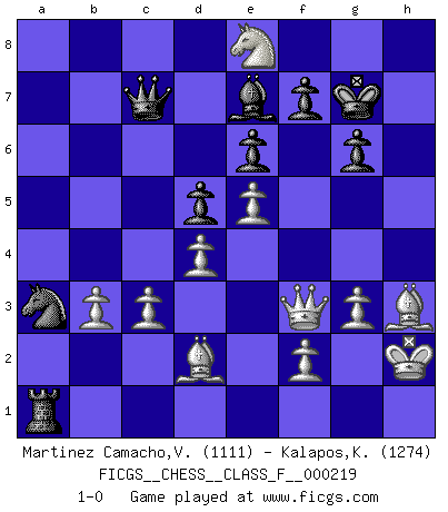 Last move : 1-0 2019 October 19 17:39:38 [Event "FICGS__CHESS__CLASS_F__000219"] [Site "FICGS"] [Date "2019.08.24"] [Round "1"] [White "Martinez Camacho,Victor Hugo"] [Black "Kalapos,Karol"] [Result "1-0"] [WhiteElo "1111"] [BlackElo "1274"] 1.e4 e6 2.d4 d5 3.Nd2 Nf6 4.e5 Nfd7 5.Ngf3 c5 6.c3 Nc6 7.Bb5 Na5 8.O-O Be7 9.Nb3 Nxb3 10.Qxb3 c4 11.Qc2 O-O 12.b3 cxb3 13.Qxb3 Nb6 14.Qc2 a6 15.Bd3 g6 16.Rb1 Bd7 17.Bd2 Na4 18.Rxb7 Bc6 19.R7b1 Nb6 20.Bh6 Re8 21.Rb2 Na4 22.Rb3 Nb6 23.Rfb1 Ba4 24.h3 Bxb3 25.Rxb3 Qc7 26.h4 Nc4 27.h5 Na3 28.Qe2 a5 29.hxg6 hxg6 30.Nh2 Kh7 31.Be3 Rh8 32.Qf3 Kg7 33.Ng4 Rh7 34.Nf6 Rh4 35.g3 Rh3 36.Bf1 a4 37.Bxh3 axb3 38.axb3 Nc2 39.Bd2 Ra1+ 40.Kh2 Na3 41.Ne8+ 1-0 French : Tarrasch, Closed variation Kingside Castling by player White (move 8) Kingside Castling by player Black (move 11) Player White won this chess game. Follow this game move after move (download)Chess is a terrible game. If you have no center, your opponent has a freer position. If you do have a center, then you really have something to worry about ! (Siegbert Tarrasch) Es hat in meinem Leben Zeiten gegeben, da ich sehr nahe daran war zu glauben, daß ich auch nicht eine einzige Schachpartie verlieren könnte. (José Raúl Capablanca) Estaba muy claro de que el punto vulnerable del Gran Maestro Americano (Bobby Fischer) radicaba en las posiciones de doble filo, colgantes, irracionales, donde el siempre falló en encontrar un triunfo aún en una posición de clara victoria. (Efim Geller) Dans le domaine de la peinture, de la gravure et de la sculpture, dès la première décennie de notre siècle, les artistes abandonnent la représentation de la partie d'échecs pour se concentrer sur les pièces, sur les échiquiers et sur toutes les variations auxquelles les unes et les autres peuvent donner lieu. On passe en quelque sorte d'un thème social à un thème musical (au sens de la musica médiévale, c'est-à-dire d'une notion qui inclue le rythme, l'harmonie, la construction et la déconstruction, etc.). Graphiquement et picturalement, l'échiquier apparaît comme une structure ouverte, dynamique, d'une richesse infinie, autorisant toutes les combinatoires et débouchant sur des mouvements et des rythmes de nature exponentielle. (Michel Pastoureau) There is a computer disease that anybody who works with computers knows about. It's a very serious disease and it interferes completely with the work. The trouble with computers is that you 'play' with them ! (Richard P. Feynman)