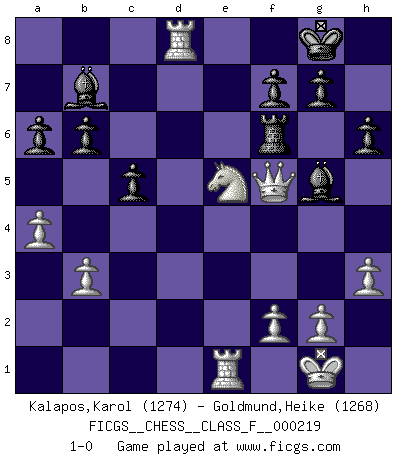 Last move : 1-0 2019 October 2 13:4:13 [Event "FICGS__CHESS__CLASS_F__000219"] [Site "FICGS"] [Date "2019.08.24"] [Round "1"] [White "Kalapos,Karol"] [Black "Goldmund,Heike"] [Result "1-0"] [WhiteElo "1274"] [BlackElo "1268"] 1.d4 Nf6 2.c4 e6 3.Nf3 c5 4.Bg5 b6 5.e3 Bb7 6.Be2 Be7 7.Nc3 O-O 8.O-O d6 9.h3 a6 10.Qc2 Nbd7 11.Rad1 Qc7 12.d5 h6 13.Bxf6 Nxf6 14.a4 exd5 15.cxd5 Rfe8 16.Qf5 Bf8 17.b3 Bc8 18.Qc2 Bb7 19.Nh4 Re5 20.Nf3 R5e8 21.Bc4 Nd7 22.e4 Nf6 23.Rfe1 Re7 24.Rd2 Rae8 25.e5 dxe5 26.d6 Qc6 27.dxe7 Bxe7 28.Bd5 Nxd5 29.Nxd5 Bd8 30.Nxe5 Qe6 31.Nf4 Bg5 32.Nxe6 Rxe6 33.Qf5 Rf6 34.Rd8+ 1-0 Queen's pawn game Kingside Castling by player Black (move 7) Kingside Castling by player White (move 8) Player White won this chess game. Follow this game move after move (download)When you don't know what to do, wait for your opponent to get an idea - it's sure to be wrong. (Tarrasch) Wenn ich mich einlogge, glauben die Leute gewöhnlich nicht, dass ich es selbst bin und sie fangen an, mir dumme Fragen zu stellen. Und wenn sie es glauben, stellen sie wieder andere dumme Fragen. (Judith Polgar) Si no le temes a Spassky, entonces elimino el elemento del dinero. (Jim Slater) La victoire dans une partie d'Echecs appartient la plupart du temps à celui qui voit un peu plus loin que l'adversaire. (Lasker) Logic : The art of thinking and reasoning in strict accordance with the limitations and incapacities of the human misunderstanding. (Ambrose Bierce)