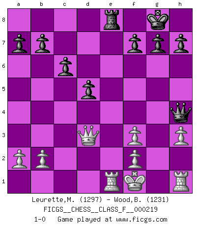 Last move : 1-0 2019 October 20 19:43:13 [Event "FICGS__CHESS__CLASS_F__000219"] [Site "FICGS"] [Date "2019.08.24"] [Round "1"] [White "Leurette,Marc-Antoine"] [Black "Wood,Brian"] [Result "1-0"] [WhiteElo "1297"] [BlackElo "1231"] 1.e4 e5 2.Nf3 Nc6 3.Bc4 Bc5 4.c3 Nf6 5.d4 exd4 6.cxd4 Bb4+ 7.Bd2 Bxd2+ 8.Nbxd2 O-O 9.e5 d5 10.exf6 Re8+ 11.Be2 Qxf6 12.Qb3 Rxe2+ 13.Kxe2 Nxd4+ 14.Nxd4 Qxd4 15.Nf3 Bg4 16.Rad1 Qe4+ 17.Qe3 Bxf3+ 18.gxf3 Qc4+ 19.Qd3 Re8+ 20.Kf1 Qh4 21.h3 c6 22.Re1 1-0 Giuoco Piano Kingside Castling by player Black (move 8) Player White won this chess game. Follow this game move after move (download)For me, Chess is life and every game is like a new life. Every Chess player gets to live many lives in one lifetime. (Eduard Gufeld) Das Blackmar-Diemer-Gambit verändert den ganzen Menschen! (Emil Joseph Diemer) Me gusta decir que Bobby Fischer fue el mejor jugador que jamás haya existido. Pero lo que hizo de Fischer un genio, fue su habilidad de mezclar una frescura y pragmatismo Americano con ideas Rusas acerca de la estrategia. (Bruce Pandolfini) Aux échecs, les retours au sommet sont rares : les dommages psychologiques consécutifs à une défaite sont trop sévères. (Daily Telegraph) Live, lose, and learn, by observing your opponent how to win. (Amber Steenbock)