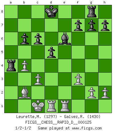 Last move : 1/2-1/2 2019 September 9 16:41:54 [Event "FICGS__CHESS__RAPID_D__000125"] [Site "FICGS"] [Date "2019.08.26"] [Round "1"] [White "Leurette,Marc-Antoine"] [Black "Galvez,Ricardo"] [Result "1/2-1/2"] [WhiteElo "1297"] [BlackElo "1430"] 1.e4 d6 2.d4 Nf6 3.Nc3 c6 4.b3 Qa5 5.Bb2 Nxe4 6.f3 Nxc3 7.Qd2 Qc7 8.Qxc3 e6 9.O-O-O a5 10.d5 exd5 11.Rxd5 Be6 12.Rd1 Na6 13.Bc4 d5 14.Bxa6 Rxa6 15.Ne2 a4 16.Nd4 Bd6 17.Rhe1 axb3 18.Nxb3 Rg8 19.Nc5 Bxc5 20.Qxc5 b6 21.Qb4 Qe7 22.a3 Qxb4 23.axb4 Ra4 24.c3 Kd8 1/2-1/2 Pirc : Ufimtsev-Pytel variation Queenside Castling by player White (move 9) This chess game ended in a draw. Follow this game move after move (download)I don't believe in psychology. I believe in good moves. (Bobby Fischer) Immer nach dem besten Zug zu suchen ist ziemlich unpraktisch. (Nigel Short) Coloca el contenido de las piezas del Ajedrez en un sombrero, agitalo vigorosamente, arrojalas en un tablero desde una altura de 30 centimetros y así obtendras el estilo de Steinitz. (H. E. Bird) Le profane ne songe pas à la somme de jouissance dont il se prive, qui méconnaît ce jeu aux ressources aussi variées que passionnantes. (Jean-Marie Jeanton-Lamarche) No enterprise is more likely to succeed than one concealed from the enemy until it is ripe for execution. (Niccolo Machiavelli)