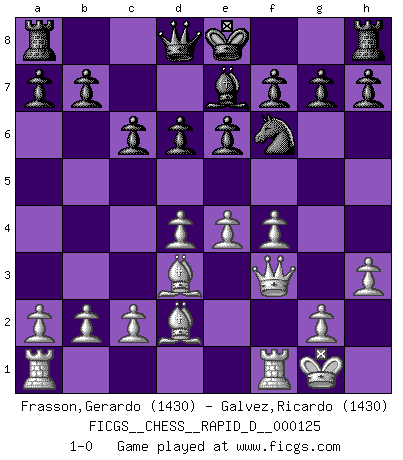 Last move : 1-0 2019 October 18 13:3:8 [Event "FICGS__CHESS__RAPID_D__000125"] [Site "FICGS"] [Date "2019.08.26"] [Round "1"] [White "Frasson,Gerardo"] [Black "Galvez,Ricardo"] [Result "1-0"] [WhiteElo "1430"] [BlackElo "1430"] 1.d4 d6 2.e4 Nf6 3.Nc3 c6 4.f4 Qa5 5.Bd2 Nbd7 6.Nd5 Qd8 7.Nxf6+ Nxf6 8.Bd3 Bg4 9.Nf3 e6 10.O-O Be7 11.h3 Bxf3 12.Qxf3 1-0 This chess game has been lost on time (started : 2019.08.26 3:7:14) Queen's Pawn Kingside Castling by player White (move 10) Player White won this chess game. Follow this game move after move (download)To avoid losing a piece, many a person has lost the game. (Savielly Tartakover) Wer wird heute Abend ihr Gegner sein? -- Heute Abend spiele ich gegen die schwarzen Steine. (Akiba Rubinstein) a manera como él juega al Ajedrez, demuestra la completa naturaleza de un hombre. (Stanley Ellin) Des combinaisons [dans le jeu d'échecs] pareilles à des mélodies. Je crois entendre pour ainsi dire la musique des coups... (Vladimir Nabokov) There is no vagueness without wind. (Chinese proverb)