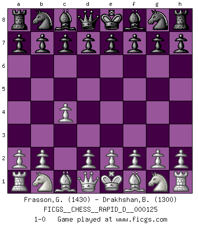 Last move : 1-0 2019 September 26 9:57:19 [Event "FICGS__CHESS__RAPID_D__000125"] [Site "FICGS"] [Date "2019.08.26"] [Round "1"] [White "Frasson,Gerardo"] [Black "Drakhshan,Bahram"] [Result "1-0"] [WhiteElo "1430"] [BlackElo "1300"] 1.c4 1-0 This chess game has been lost on time (started : 2019.08.26 3:7:14) English Opening Player White won this chess game. Follow this game move after move (download)The hallmark of the artist is simplicity. (Larry Evans) Ein Gewinn durch eine ungenaue Kombination, sei sie auch noch so vorzeigbar, erfüllt mich mit Schaudern. (Wilhelm Steinitz) Me gusta decir que Bobby Fischer fue el mejor jugador que jamás haya existido. Pero lo que hizo de Fischer un genio, fue su habilidad de mezclar una frescura y pragmatismo Americano con ideas Rusas acerca de la estrategia. (Bruce Pandolfini) Avec des compensations pour le matériel en plus... (Anonyme) Control your own destiny or someone else will. (Jack Welch)