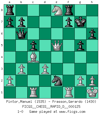 Last move : 1-0 2019 September 23 14:50:28 [Event "FICGS__CHESS__RAPID_D__000125"] [Site "FICGS"] [Date "2019.08.26"] [Round "1"] [White "Pintor,Manuel"] [Black "Frasson,Gerardo"] [Result "1-0"] [WhiteElo "1535"] [BlackElo "1430"] 1.e4 e5 2.f4 exf4 3.Nf3 d6 4.Bc4 Bg4 5.O-O Nf6 6.Nc3 c5 7.d3 Nc6 8.Bxf4 Bxf3 9.Qxf3 Nd4 10.Qh3 Nxc2 11.Rac1 Nd4 12.Kh1 Qb6 13.b3 h6 14.e5 dxe5 15.Bxe5 Be7 16.Qg3 g5 17.Bxf6 Ne2 18.Qe5 O-O 19.Nd5 Bxf6 20.Nxf6+ Kg7 21.Ne8+ 1-0 KGA : Fischer defense Kingside Castling by player White (move 5) Kingside Castling by player Black (move 18) Player White won this chess game. Follow this game move after move (download)Not all artists are Chess players, but all Chess players are artists. (Marcel Duchamp) Lisa Lane, amerikanische Schachmeisterin, hatte Fischer einmal als stärksten lebenden Spieler bezeichnet. Antwort: Das ist richtig, aber Lisa Lane ist eigentlich nicht in der Lage, das zu beurteilen. (Robert James Fischer) El Ajedrez es un terrible juego. Si no controlas el centro, tu oponente tiene una posición mas holgada. Si tienes control del centro, ¡entonces realmente tu tienes algo de que preocuparte!. (Siegbert Tarrasch) L'action d'une oeuvre littéraire se déroule sur un champ de bataille. Les masques et les types du drame moderne correspondent aux pièces du jeu d'échecs. L'intrigue correspond aux coups et aux gambits, c'est à dire aux techniques du jeu telles qu'utilisées et interprétées par les joueurs. Les tactiques et les péripéties [mouvements] correspondent aux coups exécutés par l'adversaire. (Viktor Shklovsky) Whenever people agree with me, I always feel I must be wrong. (Oscar Wilde)