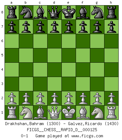 Last move : 0-1 2019 September 25 4:52:37 [Event "FICGS__CHESS__RAPID_D__000125"] [Site "FICGS"] [Date "2019.08.26"] [Round "1"] [White "Drakhshan,Bahram"] [Black "Galvez,Ricardo"] [Result "0-1"] [WhiteElo "1300"] [BlackElo "1430"] 0-1 This chess game has been lost on time (started : 2019.08.26 3:7:14) Player Black won this chess game. Follow this game move after move (download)When you are lonely, when you feel yourself an alien in the world, play Chess. This will raise your spirits and be your counselor in war. (Aristotle) Wenn sie aufgeben, dann danke ich Ihnen für das Spiel (Eventualzug beim Fernschach). (Anonymous) La pasion por jugar al Ajedrez es una de las mas inexplicables en el mundo. (H.G. Wells) Les erreurs sont comme les malheurs, elles n'arrivent jamais seules. (Siegbert Tarrasch) In God we trust, all others we virus scan. (Anonymous)