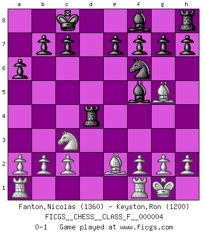 Last move : 0-1 2006 September 9 5:58:46 [Event "FICGS__CHESS__CLASS_F__000004"] [Site "FICGS"] [Date "2006.06.18"] [Round "1"] [White "Fanton,Nicolas"] [Black "Keyston,Ron"] [Result "0-1"] [WhiteElo "1360"] [BlackElo "1200"] 1.e4 d5 2.exd5 Qxd5 3.Nc3 Qd6 4.Nf3 Nf6 5.d4 a6 6.Bg5 Nc6 7.Be2 Bf5 8.O-O O-O-O 9.Qd2 Nxd4 10.Nxd4 Qxd4 11.Qxd4 Rxd4 0-1 This chess game has been lost on time (started : 2006.06.18 21:18:40) Scandinavian : Pytel-Wade variation Kingside Castling by player White (move 8) Queenside Castling by player Black (move 8) Player Black won this chess game. Follow this game move after move (download)Fischer is the strongest player in the world. In fact, the strongest player who ever lived. (Larry Evans) Gegen einen Schachcomputer zu verlieren ist wie Löcher in den Strümpfen zuhaben. Es ist nicht peinlich, solange man der einzige ist der es weiß. (Anonymous) El arma más poderosa en el Ajedrez, es tener la próxima movida. (David Bronstein) 'L'échange des dames est un coup dur pour les deux adversaires...' Un journaliste lors d'une partie du match Spassky-Fischer Indecision is the key to flexibility. (Unknown)