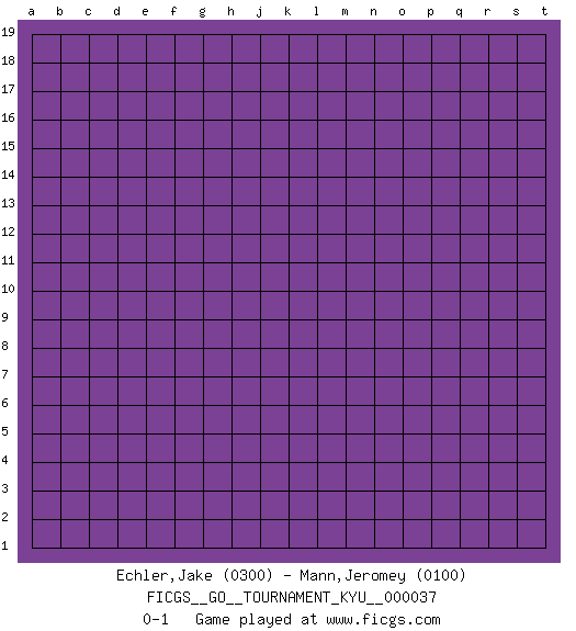 Last move : 0-1 2007 July 22 0:15:10 [Event "FICGS__GO__TOURNAMENT_KYU__000037"] [Site "FICGS"] [Date "2007.06.21"] [Round "1"] [Black "Echler,Jake"] [White "Mann,Jeromey"] [Result "0-1"] [Rating 1 "0300"] [Rating 2 "0100"] 0-1 This go game has been lost on time (started : 2007.06.21 21:37:48) Here are the names of the openings (joseki) played in the four corners : Player White won this Go (weiqi, baduk) game. Follow this game move after move (download)Every move brings change. (Pierre Audouard) Now the reason the enlightened prince and the wise general conquer the enemy whenever they move and their achievements surpass those of ordinary men is foreknowledge. (Sun Tzu)