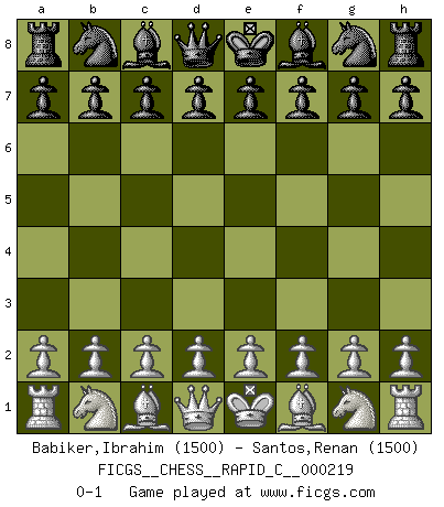 Last move : 0-1 2019 September 27 12:17:57 [Event "FICGS__CHESS__RAPID_C__000219"] [Site "FICGS"] [Date "2019.08.28"] [Round "1"] [White "Babiker,Ibrahim"] [Black "Santos,Renan"] [Result "0-1"] [WhiteElo "1500"] [BlackElo "1500"] 0-1 This chess game has been lost on time (started : 2019.08.28 1:30:11) Player Black won this chess game. Follow this game move after move (download)Chess is life. (Bobby Fischer) Schachspieler können ausgezeichnet Varianten am Schachbrett berechnen, aber nicht im realen Leben. Zu stark ist der Individualismus im Schach ausgeprägt, und für viele ist ein kleiner momentaner persönlicher Vorteil wichtiger als ein weit größerer Vorteil von morgen. (Anatoly Karpov) Yo nunca en mi vida he jugado la Defensa Francesa, que viene siendo la más aburrida de todas las Aperturas. (Wilhelm Steinitz) Shah mat. Le roi est mort. Cri de fierté d'un joueur venant de terrasser son adversaire, courtoisement, sans effusion de sang. Knowledge rests not upon truth alone, but upon error also. (Carl G. Jung)