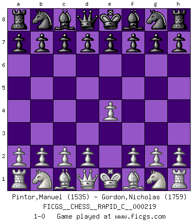 Last move : 1-0 2019 September 28 1:3:13 [Event "FICGS__CHESS__RAPID_C__000219"] [Site "FICGS"] [Date "2019.08.28"] [Round "1"] [White "Pintor,Manuel"] [Black "Gordon,Nicholas"] [Result "1-0"] [WhiteElo "1535"] [BlackElo "1759"] 1.e4 1-0 This chess game has been lost on time (started : 2019.08.28 1:30:11) King's pawn Opening Player White won this chess game. Follow this game move after move (download)Bobby Fischer's current state of mind is indeed a tragedy. One of the world's greatest Chess players - the pride and sorrow of American Chess. (Frank Brady) Was ist der Unterschied zwischen einem Strassenarbeiter und einem Schachspieler? --Der Schachspieler bewegt sich ab und zu. (Anonymous) Todo se encuentra en un estado de flujo y esto incluye al mundo del Ajedrez. (Mikhail Botvinnik) Les Echecs sont affaire de jugement sensible. Savoir quand frapper et quand esquiver. (Fischer) Warrior pose battles inner weakness and wins focus. You see that there is no war within you. You're on your own side, and you are your own strength. (Terri Guillemets)