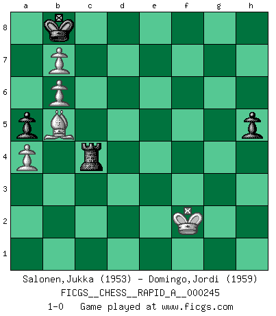 Last move : 1-0 2019 October 31 14:1:40 [Event "FICGS__CHESS__RAPID_A__000245"] [Site "FICGS"] [Date "2019.08.30"] [Round "1"] [White "Salonen,Jukka"] [Black "Domingo,Jordi"] [Result "1-0"] [WhiteElo "1953"] [BlackElo "1959"] 1.d4 h6 2.e4 c5 3.Nf3 cxd4 4.Nxd4 a6 5.Nc3 e5 6.Be2 exd4 7.Qxd4 Nc6 8.Qd3 Nf6 9.Bf4 d5 10.exd5 Nb4 11.Qe3+ Be6 12.O-O-O Nbxd5 13.Nxd5 Nxd5 14.Qe5 Qe7 15.Rhe1 Rd8 16.Bh5 Nxf4 17.Rxd8+ Qxd8 18.Qxf4 Be7 19.Rxe6 O-O 20.Rxe7 Qxe7 21.Qe3 Qxe3+ 22.fxe3 Rd8 23.Be2 Kf8 24.c4 Ke7 25.Kc2 Kd6 26.Kc3 b6 27.a3 Ke5 28.Bf3 Rd7 29.b4 f5 30.g3 g5 31.Kc2 a5 32.Bc6 Re7 33.b5 f4 34.gxf4+ gxf4 35.c5 fxe3 36.cxb6 Kd6 37.Kd1 e2+ 38.Ke1 Re3 39.b7 Kc7 40.a4 Kb8 41.h4 Rh3 42.h5 Rxh5 43.Kxe2 Rh4 44.b6 h5 45.Kf2 Rc4 46.Bb5 1-0 Queen's pawn Queenside Castling by player White (move 12) Kingside Castling by player Black (move 19) 10 pieces endgame at move 42 : White KBPPP , Black KRPPP WHITE : King + 1 Bishop 3 Pawns BLACK : King + 1 Rook 3 Pawns 9 pieces endgame at move 43 : White KBPPP , Black KRPP WHITE : King + 1 Bishop 3 Pawns BLACK : King + 1 Rook 2 Pawns Player White won this chess game. Follow this game move after move (download)Chess is a fighting game which is purely intellectual and includes chance. (Richard Reti) Im Leben werden Partien nie so unstrittig gewonnen wie im Spiel (Emanuel Lasker) Repentinamente, me resultaba obvio en mi analisis que yo había pasado por alto lo que Fischer había visto en el tablero con la mas grande facilidad. (Mikhail Botvinnik) Un footballeur joue avec ses pieds, parfois avec sa tête. Un joueur d'échecs ne joue qu'avec sa tête. Et quand il ne joue plus, il meurt. (Jacob Murray) The intuitive mind is a sacred gift; the rational mind is a faithful servant. We have created a society that honors the servant but has forgotten the gift. (Albert Einstein)