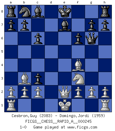 Last move : 1-0 2019 October 24 17:9:1 [Event "FICGS__CHESS__RAPID_A__000245"] [Site "FICGS"] [Date "2019.08.30"] [Round "1"] [White "Cesbron,Guy"] [Black "Domingo,Jordi"] [Result "1-0"] [WhiteElo "2083"] [BlackElo "1959"] 1.e4 e5 2.Nf3 d5 3.exd5 Qxd5 4.Nc3 Qe6 5.Bb5+ c6 6.Ba4 Qg6 7.Qe2 Be7 8.Bb3 Nh6 9.d3 f6 10.d4 exd4 11.Bxh6 dxc3 12.Bf4 1-0 This chess game has been lost on time (started : 2019.08.30 9:26:8) QP counter-gambit (elephant gambit) Player White won this chess game. Follow this game move after move (download)Chess is played with the mind and not with the hands ! (Renaud and Kahn) Wer mein Gambit spielt, muß bereit sein, alle Brücken hinter sich abzubrechen. Es verändert den ganzen Menschen. Es wirkt wie ein Zauberstab und fördert verkümmerte, gute Charakter- eigenschaften wieder zu Tage. (Emil Joseph Diemer) Todavía soy una víctima del Ajedrez. Tiene toda la belleza del arte y mucho mas. No puede ser comercializado. El Ajedrez es mas puro que el arte en su posición social. (Marcel Duchamp) Aux échecs, les retours au sommet sont rares : les dommages psychologiques consécutifs à une défaite sont trop sévères. (Daily Telegraph) Memory is a complicated thing, a relative to truth, but not its twin. (Barbara Kingsolver, Animal Dreams)