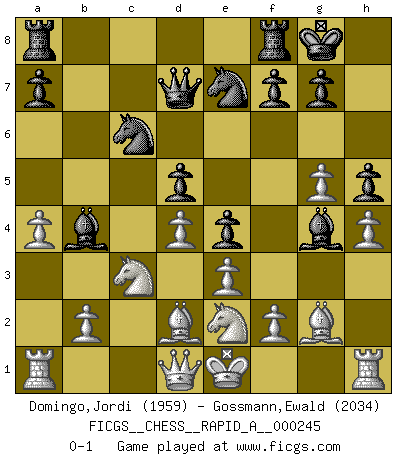 Last move : 0-1 2019 October 18 13:3:8 [Event "FICGS__CHESS__RAPID_A__000245"] [Site "FICGS"] [Date "2019.08.30"] [Round "1"] [White "Domingo,Jordi"] [Black "Gossmann,Ewald"] [Result "0-1"] [WhiteElo "1959"] [BlackElo "2034"] 1.g4 d5 2.Bg2 c6 3.h3 e5 4.d4 e4 5.c4 h5 6.g5 Bd6 7.Nc3 Ne7 8.h4 Be6 9.e3 Qd7 10.Nge2 b5 11.cxd5 cxd5 12.a4 Nbc6 13.Nxb5 Bb4+ 14.Nbc3 Bg4 15.Bd2 O-O 0-1 This chess game has been lost on time (started : 2019.08.30 9:26:8) Grob's attack Kingside Castling by player Black (move 15) Player Black won this chess game. Follow this game move after move (download)Castle early and often. (Rob Sillars) Frage: Wie viele Autos haben Sie schon zerstört? - Antwort: Nur zwei. (Loek van Wely) Ciertamente, de todas la drogas del mundo, el Ajedrez debe ser el mas placentero permamentemente. (Assiac) Il a essayé de se convaincre qu'il pourrait empêcher toutes les erreurs et ne jamais perdre. L'horreur ! Gary Kasparov au sujet de Robert Fischer. Panic is a sudden desertion of us, an a going over to the enemy of our imagination. (Christian Nevell Bovee)