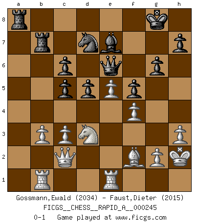 Last move : 0-1 2019 November 24 21:33:4 [Event "FICGS__CHESS__RAPID_A__000245"] [Site "FICGS"] [Date "2019.08.30"] [Round "1"] [White "Gossmann,Ewald"] [Black "Faust,Dieter"] [Result "0-1"] [WhiteElo "2034"] [BlackElo "2015"] 1.e4 e5 2.Nf3 Nc6 3.Bb5 d6 4.d4 exd4 5.Nxd4 Bd7 6.Nc3 Nf6 7.O-O Be7 8.Nxc6 Bxc6 9.Bxc6+ bxc6 10.Be3 O-O 11.f4 Qc8 12.h3 Nd7 13.Qg4 Rb8 14.Rab1 Nb6 15.Qg3 f5 16.Rbe1 Qd7 17.b3 d5 18.e5 c5 19.Ne2 a5 20.Bf2 a4 21.Rd1 Qe6 22.c3 c6 23.Rb1 Rb7 24.Qd3 axb3 25.axb3 g6 26.Qc2 Rfb8 27.Kh2 Qc8 28.Nc1 Ra8 29.Re1 Qe6 30.Nd3 Nd7 0-1 This chess game has been lost on time (started : 2019.08.30 9:26:8) Ruy Lopez : Old Steinitz defense Kingside Castling by player White (move 7) Kingside Castling by player Black (move 10) Player Black won this chess game. Follow this game move after move (download)A good player is always lucky. (Jose Raul Capablanca) Wenn Du absolut nicht mehr weißt, was Du tun sollst, dann ist es Zeit für Panik. (John van der Wiel) Siempre es mucho mejor sacrificar las piezas de tu oponente. (Savielly Tartakover) Pour moi, les échecs ne sont pas un jeu mais un art. (Alexandre Alekhine) I teach you to lie, cheat and steal, and as soon as my back's turned you wait in line ? (Gregory House, House M.D.)