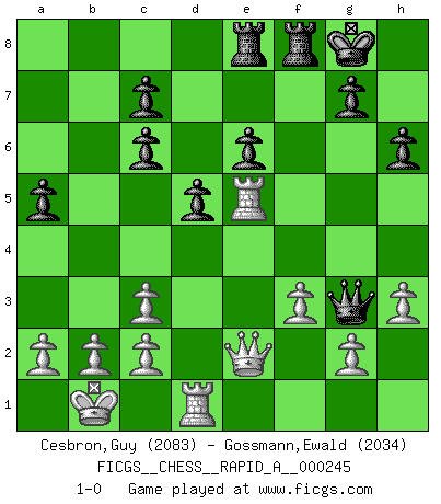 Last move : 1-0 2019 November 13 19:58:40 [Event "FICGS__CHESS__RAPID_A__000245"] [Site "FICGS"] [Date "2019.08.30"] [Round "1"] [White "Cesbron,Guy"] [Black "Gossmann,Ewald"] [Result "1-0"] [WhiteElo "2083"] [BlackElo "2034"] 1.e4 e5 2.Nf3 Nf6 3.Nxe5 d6 4.Nf3 Nxe4 5.Nc3 Nxc3 6.dxc3 Be7 7.Be3 Nc6 8.Qd2 Be6 9.O-O-O Qd7 10.Kb1 Bf6 11.Bg5 Qe7 12.Bb5 a6 13.Bxc6+ bxc6 14.Qf4 Bxg5 15.Nxg5 O-O 16.Rhe1 d5 17.f3 h6 18.Nxe6 fxe6 19.Qe3 Rae8 20.Qd3 a5 21.Re5 Qh4 22.h3 Qg3 23.Qe2 1-0 This chess game has been lost on time (started : 2019.08.30 9:26:8) Petrov : Nimzovich attack Queenside Castling by player White (move 9) Kingside Castling by player Black (move 15) Player White won this chess game. Follow this game move after move (download)I don't believe in psychology. I believe in good moves. (Bobby Fischer) Ein Kibitz ist einer, der deinem Gegner gute Ratschläge gibt. (Andrew Soltis) No es una movida, aún la mejor movida que tu debas buscar, sino un plan comprensible. (Eugene Znosko-Borovsky) Les Echecs représentent une sphère d'idées créatrices basée sur la volonté des deux protagonistes. (Smyslov) Gambling is the son of avarice and the father of despair. (French proverb)