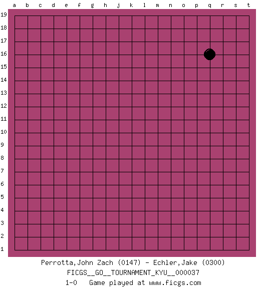 Last move : 1-0 2007 July 22 0:15:10 [Event "FICGS__GO__TOURNAMENT_KYU__000037"] [Site "FICGS"] [Date "2007.06.21"] [Round "1"] [Black "Perrotta,John Zach"] [White "Echler,Jake"] [Result "1-0"] [Rating 1 "0147"] [Rating 2 "0300"] 1.q16 1-0 This go game has been lost on time (started : 2007.06.21 21:37:48) Here are the names of the openings (joseki) played in the four corners : Player Black won this Go (weiqi, baduk) game. Follow this game move after move (download)Knight's moves win running battles. (Anonymous) Without enthusiasm, virtue functions not at all, and vice only poorly. (Mignon McLaughlin, The Neurotic's Notebook, 1960)