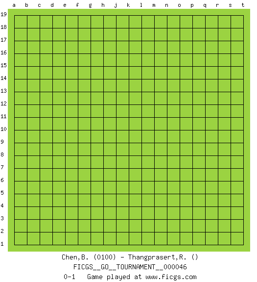 Last move : 0-1 2019 September 30 8:17:42 [Event "FICGS__GO__TOURNAMENT__000046"] [Site "FICGS"] [Date "2019.08.31"] [Round "1"] [Black "Chen,Bai Zhong"] [White "Thangprasert,Rittichai"] [Result "0-1"] [Rating 1 "0100"] 0-1 This go game has been lost on time (started : 2019.08.31 0:18:21) Here are the names of the openings (joseki) played in the four corners : Player White won this Go (weiqi, baduk) game. Follow this game move after move (download)Don't try to enclose an open skirt. (Anonymous) A computer lets you make more mistakes faster than any invention in human history - with the possible exceptions of handguns and tequila. (Mitch Ratcliffe)