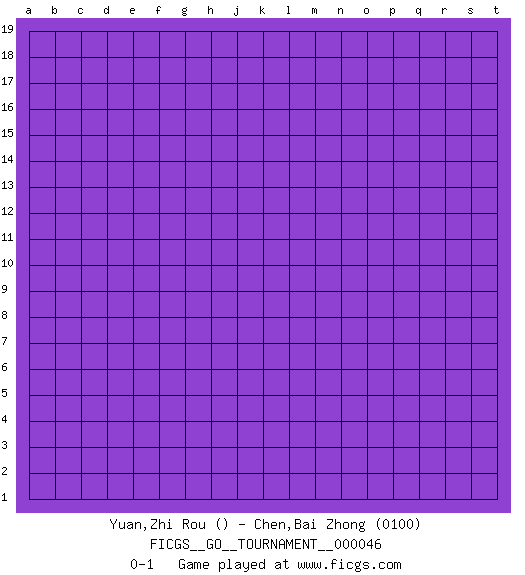 Last move : 0-1 2019 September 30 8:17:42 [Event "FICGS__GO__TOURNAMENT__000046"] [Site "FICGS"] [Date "2019.08.31"] [Round "1"] [Black "Yuan,Zhi Rou"] [White "Chen,Bai Zhong"] [Result "0-1"] [Rating 2 "0100"] 0-1 This go game has been lost on time (started : 2019.08.31 0:18:21) Here are the names of the openings (joseki) played in the four corners : Player White won this Go (weiqi, baduk) game. Follow this game move after move (download)Go is not a blocking game, it's a game of action. (Pierre Audouard) Think like a man of action, act like a man of thought. (Henri Louis Bergson)