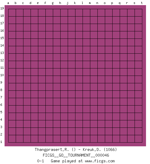 Last move : 0-1 2019 September 30 8:17:42 [Event "FICGS__GO__TOURNAMENT__000046"] [Site "FICGS"] [Date "2019.08.31"] [Round "1"] [Black "Thangprasert,Rittichai"] [White "Kreuk,Dion"] [Result "0-1"] [Rating 2 "1066"] 0-1 This go game has been lost on time (started : 2019.08.31 0:18:21) Here are the names of the openings (joseki) played in the four corners : Player White won this Go (weiqi, baduk) game. Follow this game move after move (download)One point in the center is worth ten in the corner. (Anonymous) Internet: Absolute communication, absolute isolation. (Paul Carvel)