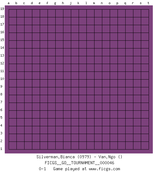 Last move : 0-1 2019 September 30 8:17:42 [Event "FICGS__GO__TOURNAMENT__000046"] [Site "FICGS"] [Date "2019.08.31"] [Round "1"] [Black "Silverman,Bianca"] [White "Van,Ngo"] [Result "0-1"] [Rating 1 "0979"] 0-1 This go game has been lost on time (started : 2019.08.31 0:18:21) Here are the names of the openings (joseki) played in the four corners : Player White won this Go (weiqi, baduk) game. Follow this game move after move (download)Do not make moves that strengthen your opponent ! (Anonymous) Remember : Your focus determines your reality. (Qui-Gon Jinn in Star Wars ep.1)