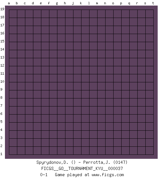 Last move : 0-1 2007 June 22 22:11:16 [Event "FICGS__GO__TOURNAMENT_KYU__000037"] [Site "FICGS"] [Date "2007.06.21"] [Round "1"] [Black "Spyrydonov,Dmitry"] [White "Perrotta,John Zach"] [Result "0-1"] [Rating 2 "0147"] 0-1 Here are the names of the openings (joseki) played in the four corners : Player White won this Go (weiqi, baduk) game. Follow this game move after move (download)Go uses the most elemental materials and concepts - line and circle, wood and stone, black and white - combining them with simple rules to generate subtle strategies and complex tactics that stagger the imagination. (Iwamoto Kaoru, 9 dan professional Go player and former Honinbo title holder) Rules and bones are meant to be broken. (Anonymous)