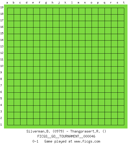 Last move : 0-1 2019 September 30 8:17:42 [Event "FICGS__GO__TOURNAMENT__000046"] [Site "FICGS"] [Date "2019.08.31"] [Round "1"] [Black "Silverman,Bianca"] [White "Thangprasert,Rittichai"] [Result "0-1"] [Rating 1 "0979"] 0-1 This go game has been lost on time (started : 2019.08.31 0:18:21) Here are the names of the openings (joseki) played in the four corners : Player White won this Go (weiqi, baduk) game. Follow this game move after move (download)Don't make a play adjacent to a cutting-point. (Anonymous) Mac users swear by their computers. PC users swear at their computers. (Author unknown)