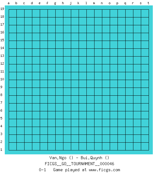 Last move : 0-1 2019 September 30 8:17:42 [Event "FICGS__GO__TOURNAMENT__000046"] [Site "FICGS"] [Date "2019.08.31"] [Round "1"] [Black "Van,Ngo"] [White "Bui,Quynh"] [Result "0-1"] 0-1 This go game has been lost on time (started : 2019.08.31 0:18:21) Here are the names of the openings (joseki) played in the four corners : Player White won this Go (weiqi, baduk) game. Follow this game move after move (download)The weak player fears ko, the strong player seeks it. (Bill Taylor) Don't be irreplaceable, if you can't be replaced, you can't be promoted. (Dan Rotaru)