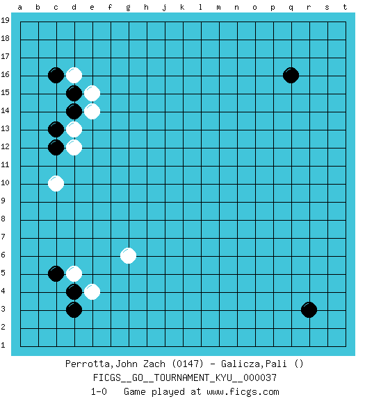Last move : 1-0 2007 August 21 4:47:44 [Event "FICGS__GO__TOURNAMENT_KYU__000037"] [Site "FICGS"] [Date "2007.06.21"] [Round "1"] [Black "Perrotta,John Zach"] [White "Galicza,Pali"] [Result "1-0"] [Rating 1 "0147"] 1.q16 g6 2.r3 d16 3.c13 c10 4.c16 d13 5.d14 d12 6.c12 e14 7.d15 e15 8.d4 d5 9.c5 e4 10.d3 1-0 This go game has been lost on time (started : 2007.06.21 21:37:48) Here are the names of the openings (joseki) played in the four corners : Corner d16 : d16 c13 Hoshi (Hwajeom, Seongjeom, Xingwei`) 4-4 Point. The star or hoshi (4-4) point, emphasizing influence at the potential expense of territory. Nikken Kakari (Dukan Keolch'im, E`r Gua`jiao~, 2-Space Low Approach). White typically answers by 7-3 or 3-5 (which is not joseki). Corner d4 : g6 d4 This joseki is unknown. A weak or weird move has probably been played in this corner. Player Black won this Go (weiqi, baduk) game. Follow this game move after move (download)The L-group is dead. (Anonymous) You can think I'm wrong, but that's no reason to quit thinking. (Gregory House, House M.D.)