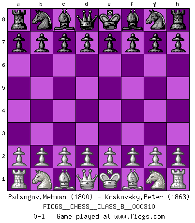 Last move : 0-1 2019 October 10 13:40:0 [Event "FICGS__CHESS__CLASS_B__000310"] [Site "FICGS"] [Date "2019.08.31"] [Round "1"] [White "Palangov,Mehman"] [Black "Krakovsky,Peter"] [Result "0-1"] [WhiteElo "1800"] [BlackElo "1863"] 0-1 This chess game has been lost on time (started : 2019.08.31 4:59:10) Player Black won this chess game. Follow this game move after move (download)A great player and a great example for many. His book My 60 Memorable Games had a big impact on me. It is a shame he didn't continue to enrich the world of chess with his unparalleled understanding after 1972. (Jan Timman, about Bobby Fischer's death) Als er Schachweltmeister wurde ließ er praktisch alle stärksten Sovietspieler für sich arbeiten. Wenn ein auch nur mittelmässiger Meister ein Spezialist für eine bestimmte Eröffnung war, wurde er von Karpov gerufen. Das wurde alles geheim gehalten. (Mikhail Moiseyevich Botvinik) Cuando tu casa esta en llamas, no puedes ser molestado por tus vecinos. O, como decinos en Ajedrez, si tu Rey esta bajo ataque, no te preocupa perder un Peón del lado de la Reina. (Gary Kasparov) Nous sommes les pions de la mystérieuse partie d'Echecs jouée par Dieu. Il nous déplace, nous arrête, nous pousse encore, puis nous lance un à un dans la boîte du Néant. Epitaphe sur la tombe de David Janowsky (1868-1927). Establishing goals is all right if you don't let them deprive you of interesting detours. (Doug Larson)
