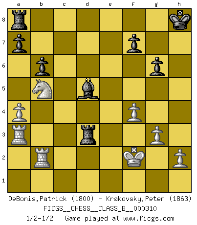 Last move : 1/2-1/2 2019 November 9 23:30:3 [Event "FICGS__CHESS__CLASS_B__000310"] [Site "FICGS"] [Date "2019.08.31"] [Round "1"] [White "DeBonis,Patrick"] [Black "Krakovsky,Peter"] [Result "1/2-1/2"] [WhiteElo "1800"] [BlackElo "1863"] 1.d4 Nf6 2.c4 e6 3.Nc3 Bb4 4.e3 O-O 5.Bd3 c5 6.Nge2 d5 7.cxd5 cxd4 8.exd4 Nxd5 9.a3 Bd6 10.O-O Nc6 11.g3 Nxc3 12.Nxc3 Bc7 13.d5 exd5 14.Nxd5 Be5 15.Bf4 Bxb2 16.Rb1 Be5 17.Re1 Bxf4 18.Nxf4 Re8 19.Qc2 Bg4 20.Bxh7+ Kh8 21.Be4 Nd4 22.Qd3 Nf3+ 23.Bxf3 Qxd3 24.Nxd3 Bxf3 25.Ne5 Bd5 26.Rbd1 Be6 27.Rb1 b6 28.Nc6 Rec8 29.Nd4 Ba2 30.Rb2 Bd5 31.f4 Rc3 32.Nb5 Rd3 33.a4 Bb3 34.Ra1 Bd5 35.Kf2 g6 36.Ra3 1/2-1/2 Nimzo-Indian : 4.e3 O-O, 5.Bd3 Kingside Castling by player Black (move 4) Kingside Castling by player White (move 10) This chess game ended in a draw. Follow this game move after move (download)When the Chess game is over, the Pawn and the King go back to the same box. (Irish saying) Ivan Sokolov treibt mich als Beifahrer an mit go Loeky go - . (Loek van Wely) Personalmente, yo prefiero mirar hacia el futuro en donde un programa de computadora gane el título mundial de Ajedrez. La humanidad necesita una lección de humildad. (Richard Dawkings) Soyez une menace à chaque fois que vous vous asseyez pour jouer. (Ken Smith) There are lots of people who mistake their imagination for their memory. (Josh Bilings)