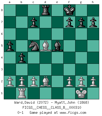 Last move : 0-1 2019 November 27 18:5:54 [Event "FICGS__CHESS__CLASS_B__000310"] [Site "FICGS"] [Date "2019.08.31"] [Round "1"] [White "Ward,David"] [Black "Myatt,John"] [Result "0-1"] [WhiteElo "2072"] [BlackElo "1868"] 1.e4 e5 2.Nf3 Nf6 3.d4 Nxe4 4.Bd3 d5 5.Nxe5 Nd7 6.Nxd7 Bxd7 7.O-O Bd6 8.Qh5 Qf6 9.Nc3 Qxd4 10.Be3 Nf6 11.Bxd4 Nxh5 12.Nxd5 O-O 13.Rfe1 Rfe8 14.Re3 Rxe3 15.Nxe3 Nf4 16.Bc4 b5 17.Bf1 Ne6 18.Bc3 a5 19.Nf5 b4 20.Bd2 Be5 21.Rb1 Nc5 22.Ne7+ Kf8 23.Nd5 Be6 24.Bc4 Bxd5 25.Bxd5 Rd8 0-1 Petrov : Modern attack, Symmetrical variation Kingside Castling by player White (move 7) Kingside Castling by player Black (move 12) Player Black won this chess game. Follow this game move after move (download)A man that will take back a move at Chess will pick a pocket. (Richard Fenton) Als ich elf wurde, wurde ich einfach gut. (Robert James Fischer) Ciertamente el estado mental actual de Bobby Fischer es una tragedia. Uno de los mas grandes jugadores de Ajedrez del mundo -el orgullo y pena del Ajedrez Americano. (Frank Brady) Aux échecs, l'amour-propre est satisfait quand on remporte la victoire, mais il n'y a pas de honte à être battu. (Benjamin Franklin) Tree pose grows confidence. It roots me to this world. (Terri Guillemets)