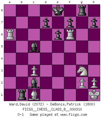 Last move : 0-1 2019 December 23 16:34:48 [Event "FICGS__CHESS__CLASS_B__000310"] [Site "FICGS"] [Date "2019.08.31"] [Round "1"] [White "Ward,David"] [Black "DeBonis,Patrick"] [Result "0-1"] [WhiteElo "2072"] [BlackElo "1800"] 1.e4 c5 2.Nc3 Nc6 3.Bb5 Nd4 4.Bc4 a6 5.Nge2 b5 6.Bd5 Rb8 7.Nxd4 cxd4 8.Ne2 Nf6 9.Bb3 Nxe4 10.Nxd4 e6 11.O-O Nc5 12.Qe2 Bb7 13.d3 Qf6 14.c3 Qg6 15.f4 Qxd3 16.Bc2 Qxe2 17.Nxe2 Na4 18.Bxa4 Bc5+ 19.Kh1 bxa4 20.f5 Be4 21.Ng3 Bc2 22.f6 gxf6 23.Rxf6 Rg8 24.b4 axb3 25.axb3 Rxb3 26.Rxa6 Rb1 0-1 Sicilian : Closed, 2...Nc6 Kingside Castling by player White (move 11) Player Black won this chess game. Follow this game move after move (download)Let the perfectionist play postal. (Yasser Seirawan) Der Freibauer hat für mich eine Seele, genau wie der Mensch, Wünsche, die unerkannt in ihm schlummern, und Befürchtungen, von deren Existenz er selbst kaum ahnt. (Aaron Nimzowitsch) El jugador táctico debe saber que hacer cuando algo se debe de hacer. El estratégico debe saber que hacer cuando nada se debe de hacer. (Savielly Tartakover) On est toujours la mazette de quelqu'un d'autre. (Anonyme) Fear is the path to the dark side. Fear leads to anger; anger leads to hate; hate leads to suffering. I sense much fear in you. (Master Yoda in Star Wars ep.1)
