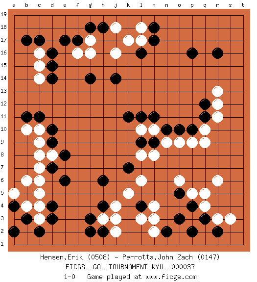 Last move : 1-0 2007 December 5 18:24:6 [Event "FICGS__GO__TOURNAMENT_KYU__000037"] [Site "FICGS"] [Date "2007.06.21"] [Round "1"] [Black "Hensen,Erik"] [White "Perrotta,John Zach"] [Result "1-0"] [Rating 1 "0508"] [Rating 2 "0147"] 1.r16 c6 2.d16 q4 3.b3 c3 4.d3 c4 5.c2 c14 6.b5 c5 7.d10 r6 8.o3 r13 9.p16 q10 10.h4 f16 11.d14 c16 12.c17 c15 13.q12 r12 14.q11 r11 15.b17 j16 16.p10 q9 17.l16 l17 18.m17 k17 19.d4 c10 20.d15 m3 21.q3 r3 22.p4 q5 23.r2 s3 24.c11 b10 25.b11 b4 26.d9 c9 27.a2 d8 28.p2 j3 29.d7 c7 30.e8 c8 31.a4 b6 32.f17 g17 33.e6 a5 34.g18 g16 35.h18 j18 36.e17 p9 37.j14 p5 38.m18 l18 39.g14 n9 40.k11 h3 41.n2 m2 42.g3 k5 43.h2 j2 44.l4 l3 45.h6 j4 46.o5 o6 47.g2 m4 48.k7 l6 49.o10 o9 50.n10 m10 51.m11 l10 52.m9 m8 53.l9 l8 54.l11 1-0 Here are the names of the openings (joseki) played in the four corners : Corner d4 : c6 b3 Oomokuhazushi 6-3 Point. The large mokuhazushi point (6-3), a remnant of the "new fuseki" movement in Japan in the 1930's. As an initial corner point, its popular usage has not stood the test of time. Corner d16 : d16 c14 Hoshi (Hwajeom, Seongjeom, Xingwei`) 4-4 Point. The star or hoshi (4-4) point, emphasizing influence at the potential expense of territory. Ikken Kakari (Hankan Keolch'im, Yi Gua`jiao~, 1-Space Low Approach). White 2 is the standard approach move to the 4-4. Corner q16 : r16 r13 Komoku (Somok, Xiao~mu`) 3-4 Point. The komoku (3-4) point is the traditional corner enclosure move.. Player Black won this Go (weiqi, baduk) game. Follow this game move after move (download)Five groups might live but the six will die. (Anonymous) A specialist learns more and more about less and less until he knows everything about nothing. (Nicholas Murray Butler)